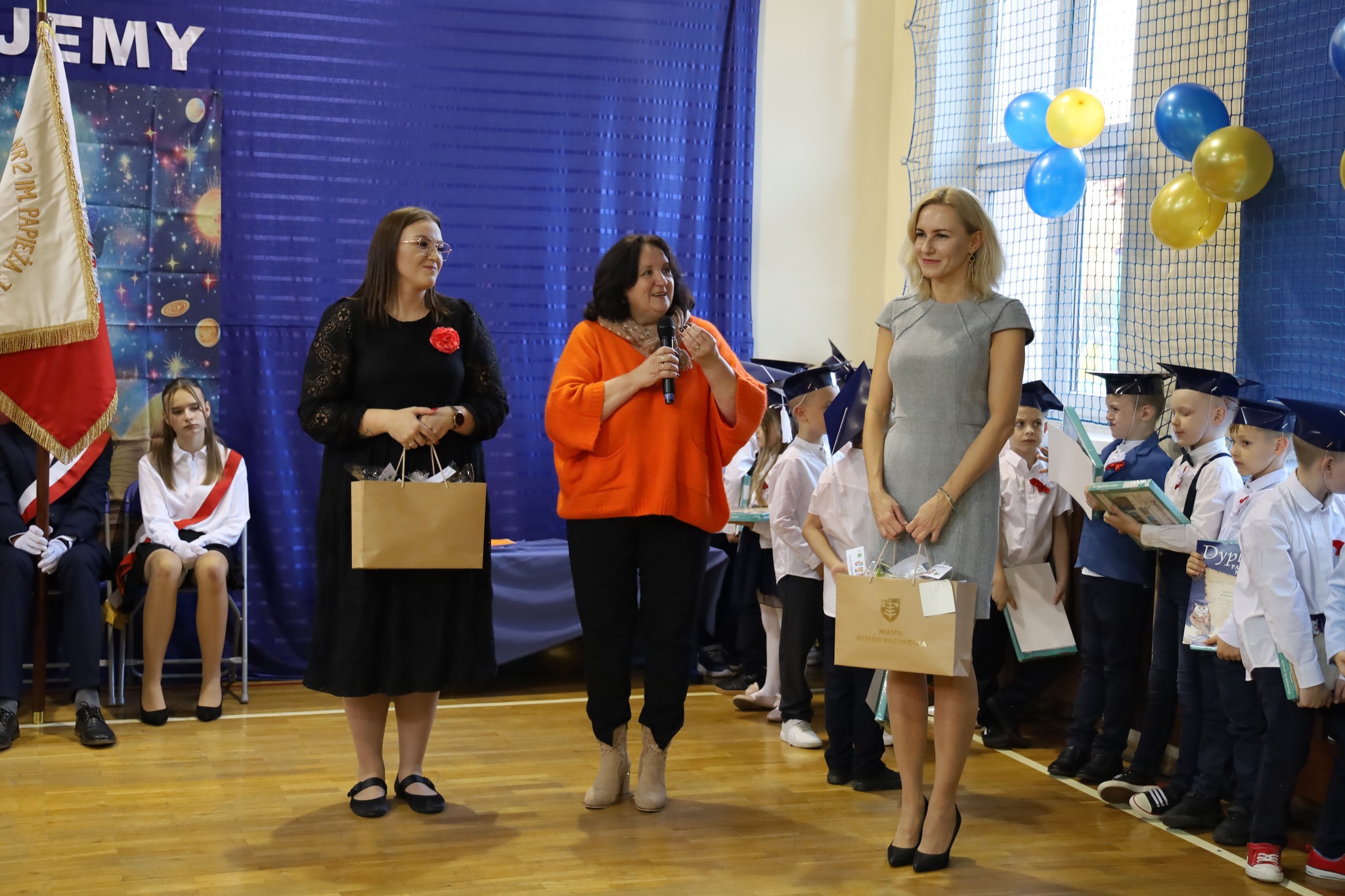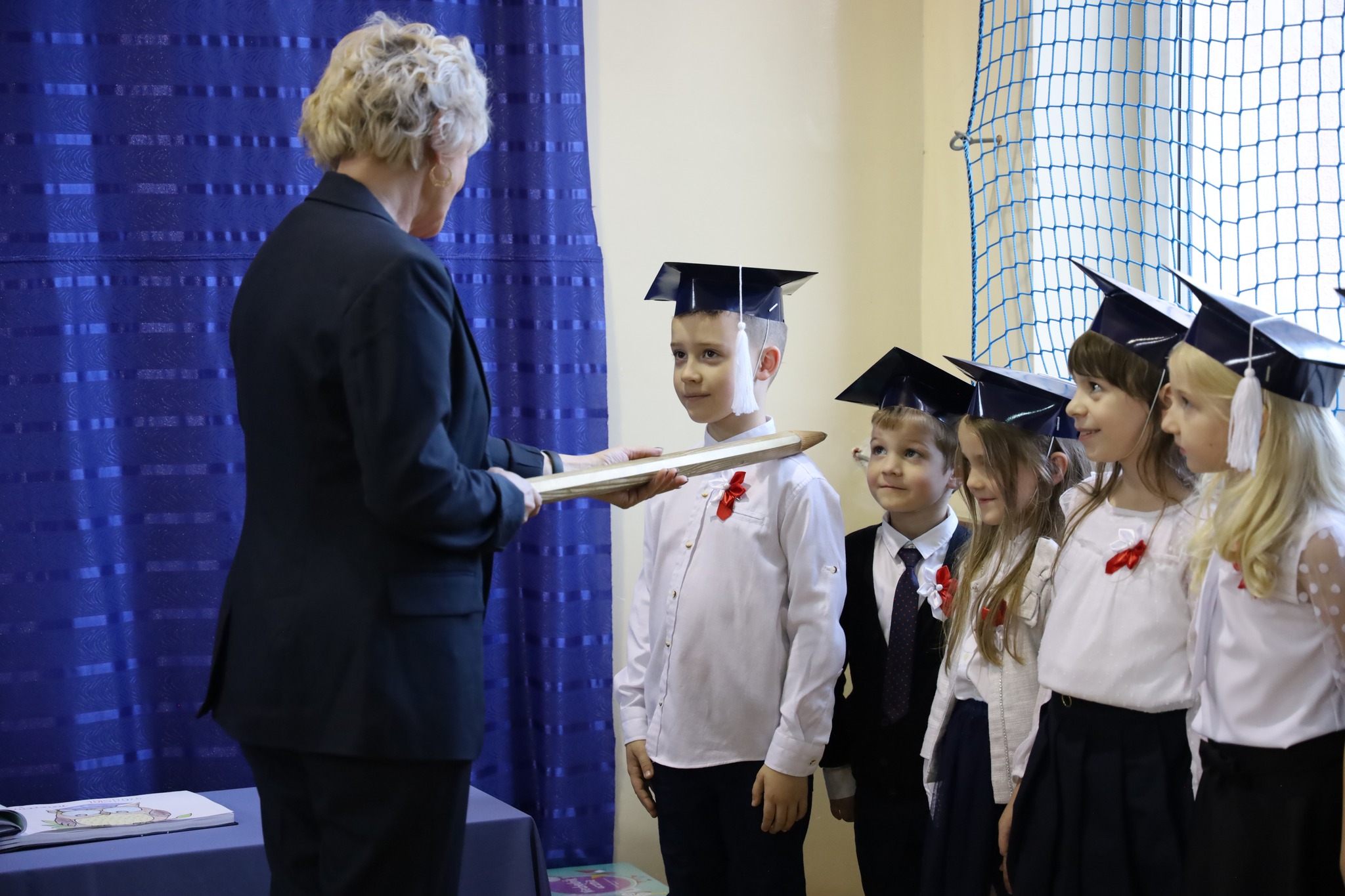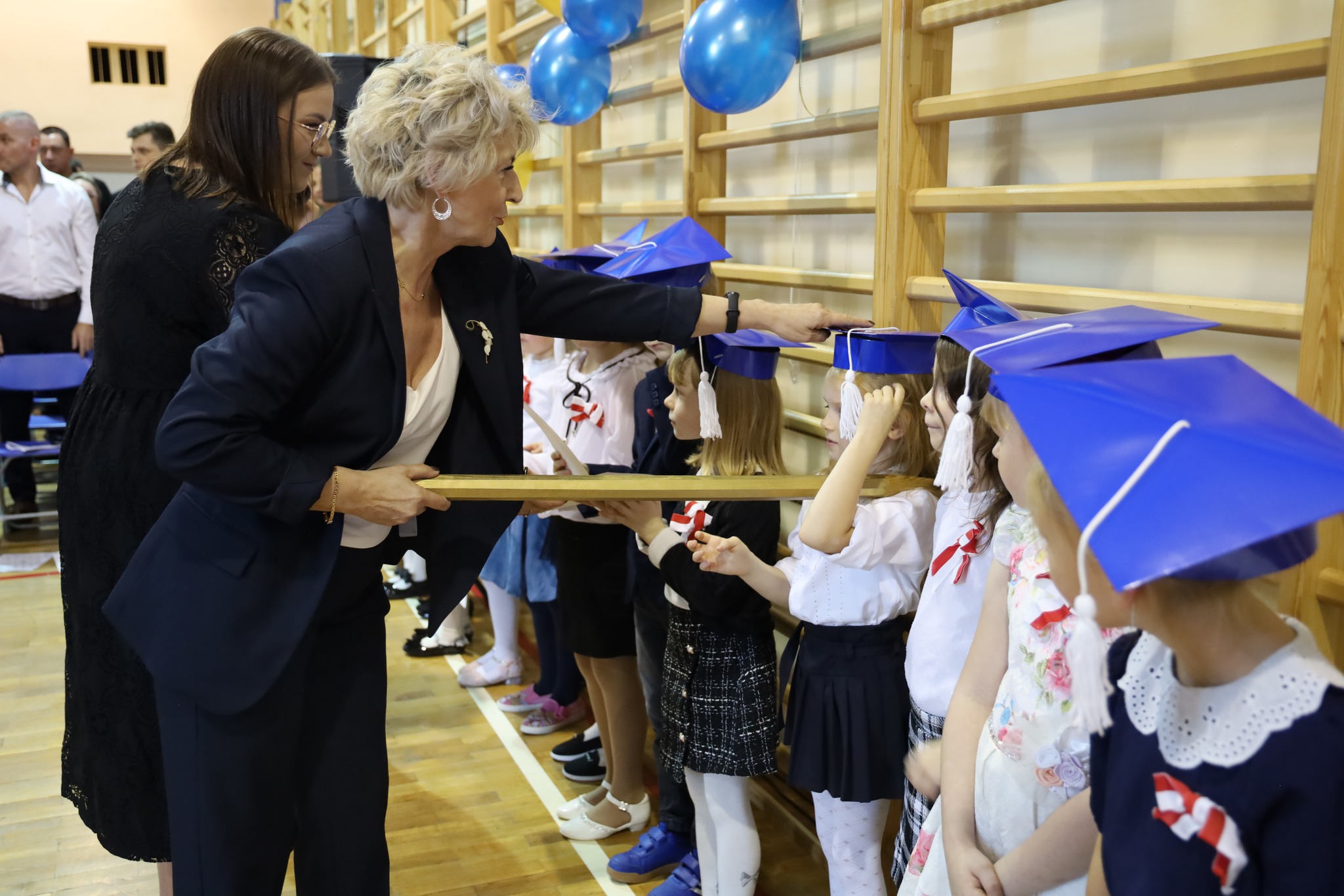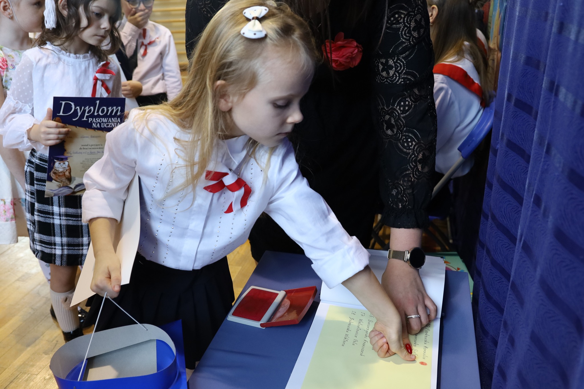 Po części artystycznej Pani Dyrektor Dorota Brzostek dokonała symbolicznego pasowania na ucznia, rozpoczynając nowy etap w szkolnym życiu dzieci.