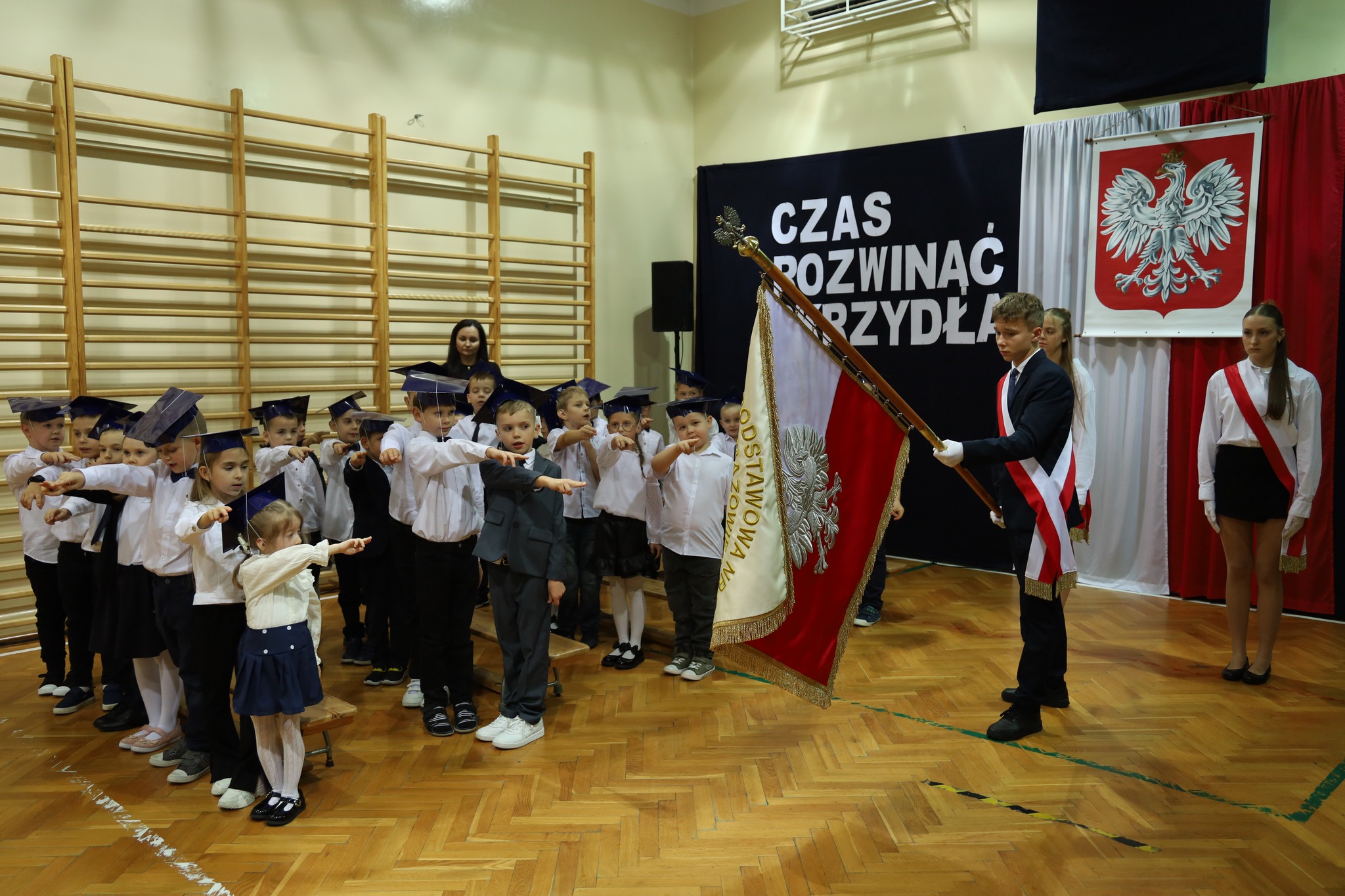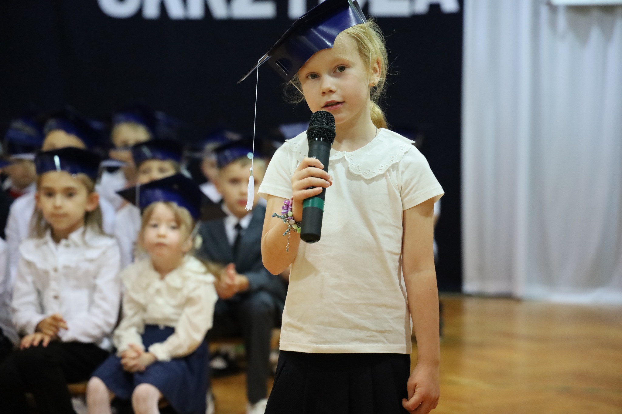 To był niezwykle ważny czas. Najmłodsi uczniowie SPnr4 oficjalnie zostali przyjęci do grona społeczności szkolnej! Uroczystość rozpoczęła część artystyczna przygotowana przez uczniów klasy pierwszej – pełna muzyki, uśmiechu i dziecięcej kreatywności. Młodzi artyści zaprezentowali swoje talenty, a publiczność nagrodziła ich gorącymi brawami.