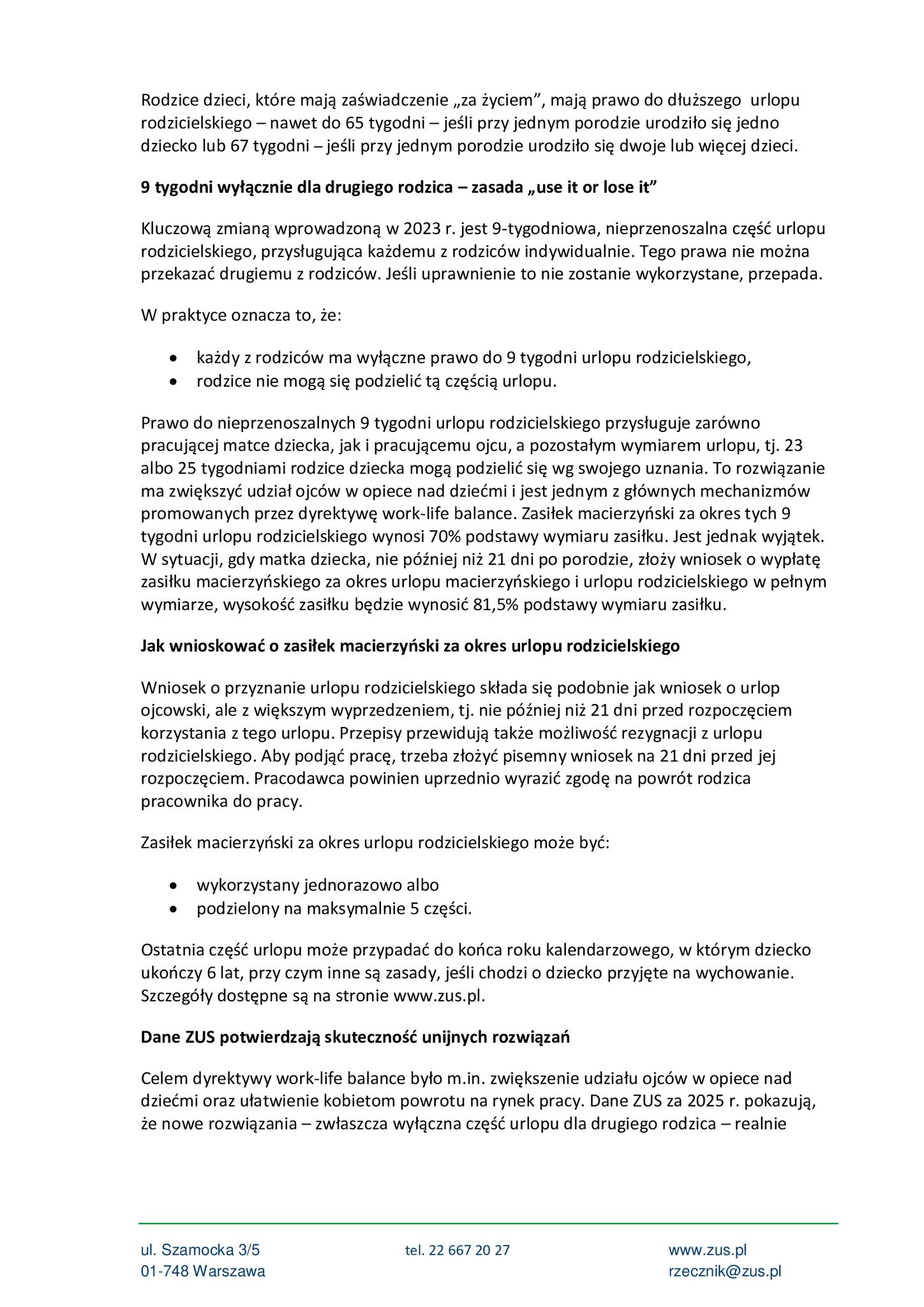 Od 2023 r. obowiązuje 9-tygodniowa, nieprzenoszalna część urlopu rodzicielskiego przysługująca każdemu z rodziców indywidualnie.